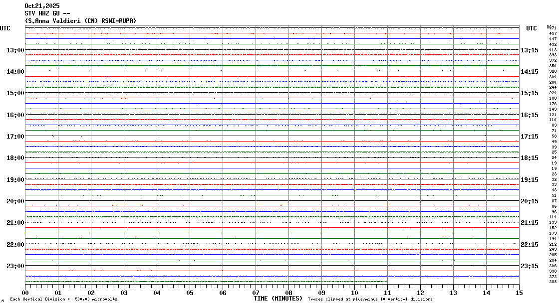 Dal 05/2006 al 12/2014 Sistema di trasmissione: Internet (RUPA) Dal 05/2006 al 10/2006 Sensore: Nanometrics Trillium 40 Dal 1996 al 04/2006 Codice stazione: STV2 Sensore: Guralp CMG 40 Sistema di digitalizzazione: Lennartz Mars 88 MC Sincronizzazione di tempo: DCF Sistema di trasmissione: Dial-up Modem Dal 1985 al 2007 Codice stazione: STVA Sensore: Geotech S13 Sistema di digitalizzazione: Lennartz 5800 Sincronizzazione di tempo: DCF Sistema di trasmissione: CDA Modem |